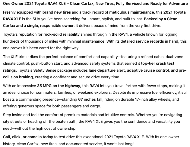 You know the basics: list the make, model, mileage, and specs. But generic descriptions fade into the background. Online you have to treat each listing like a mini sales pitch that clicks with buyers. Write like you’re chatting with a customer, using language that paints a picture. Swap “2023 Honda CR-V, 12,000 miles” for “This 2023 Honda CR-V, barely broken in at 12,000 miles, is your go-to for family road trips and smooth daily commutes.”
